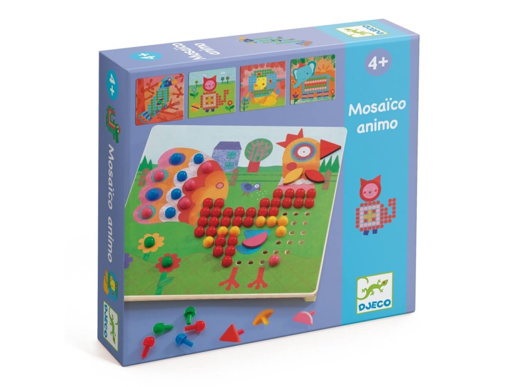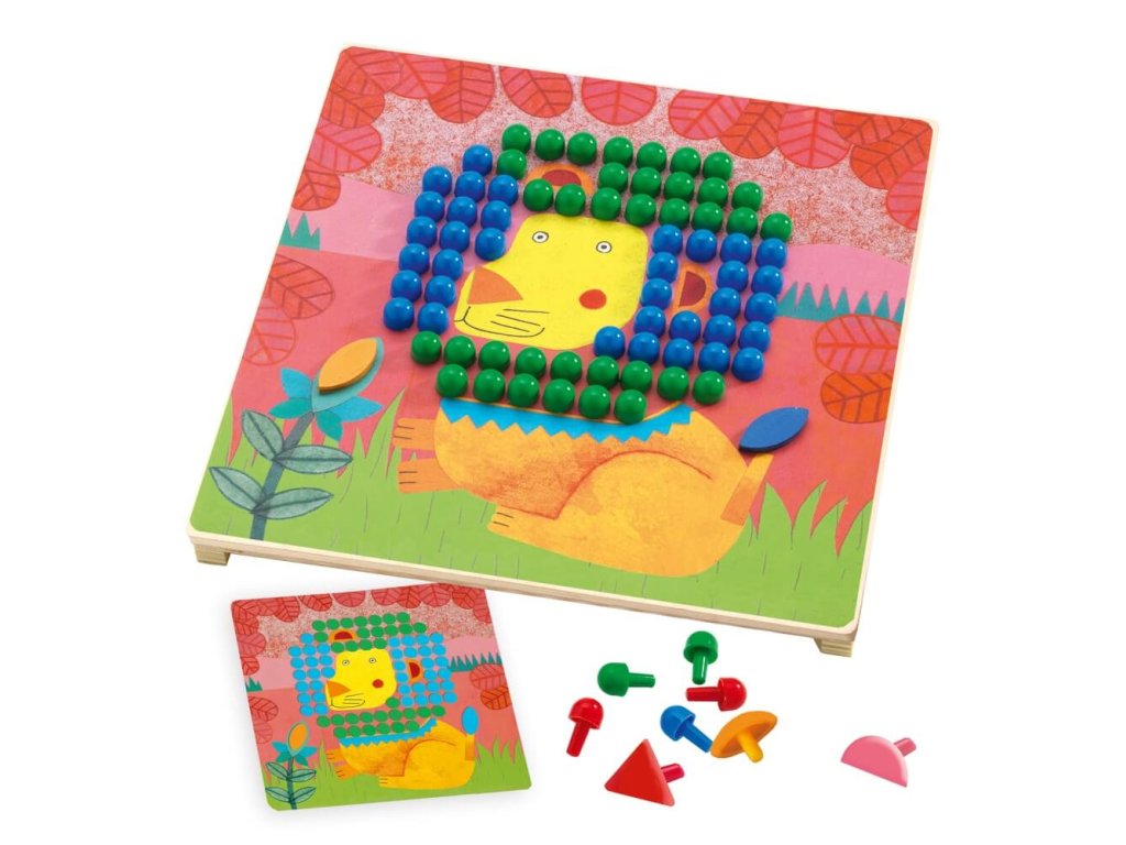 Kolíčková mozaika Animo od značky Djeco je kreatívna hračka, ktorá deti naučí tvoriť obrázky pomocou 230 farebných kolíčkov.