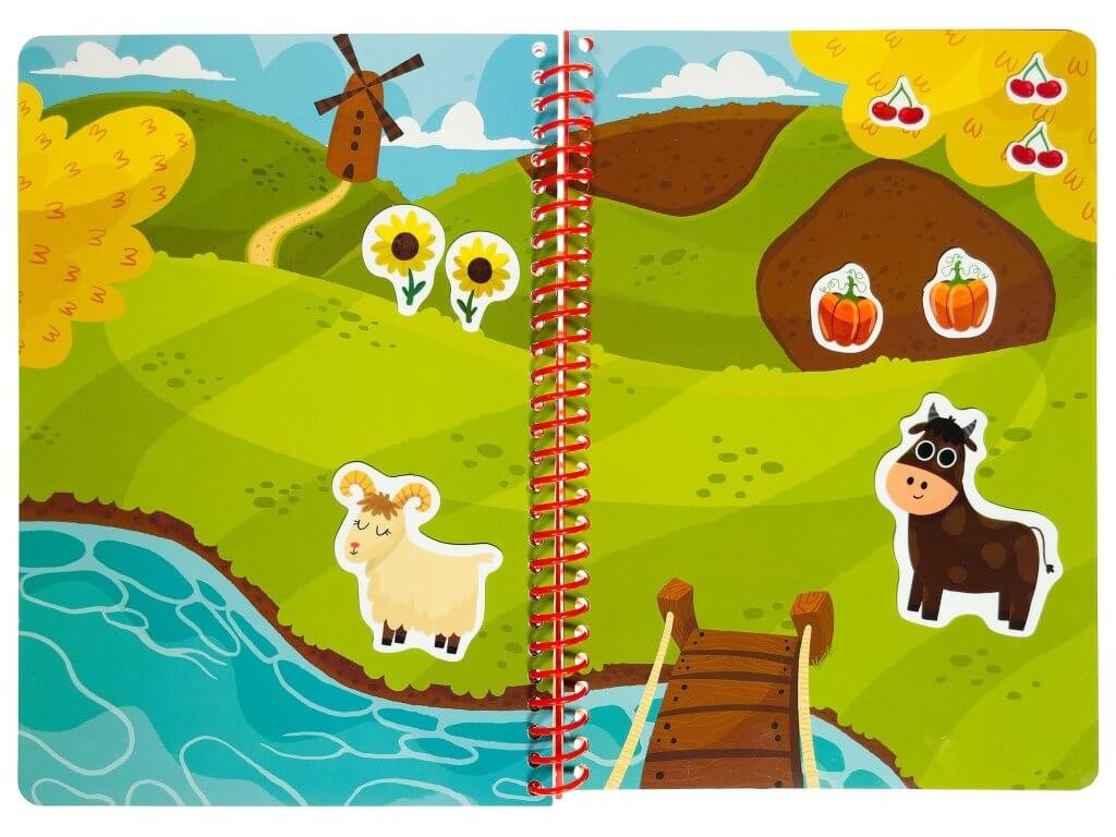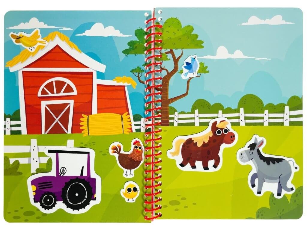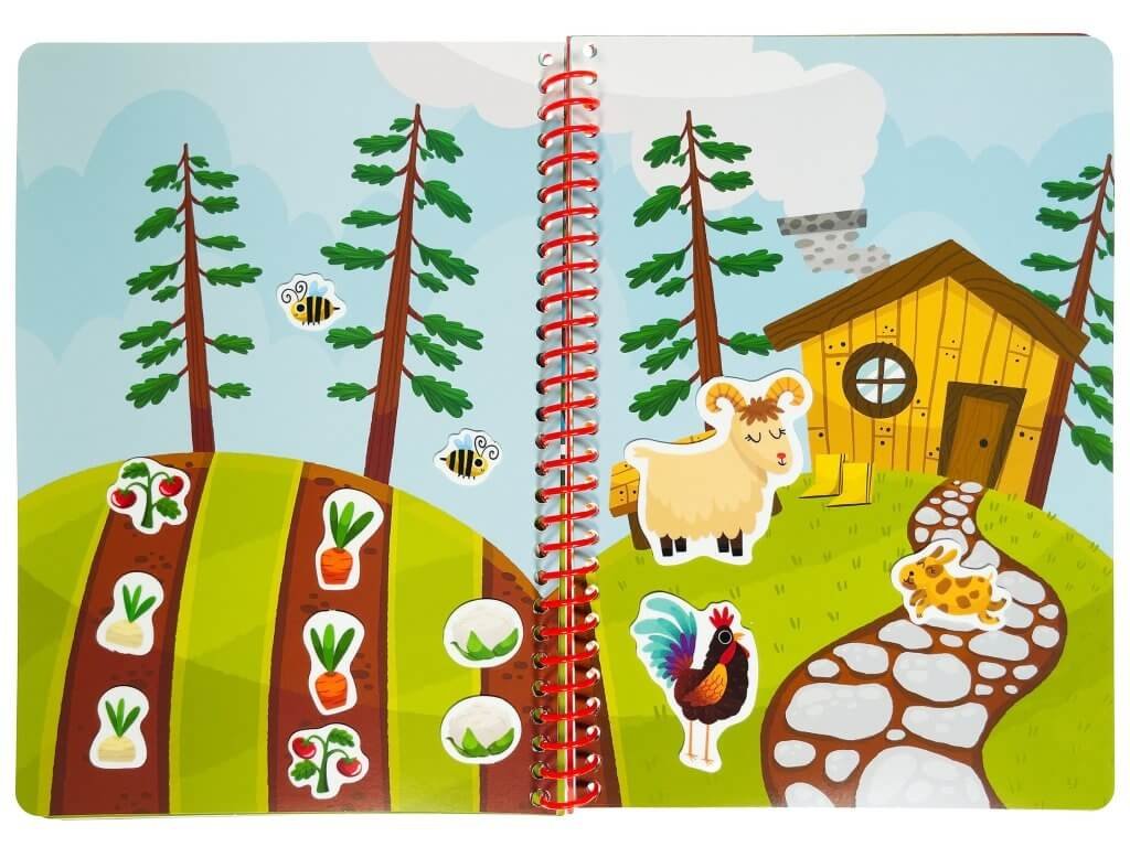 Na ilustrované stránky môžu lepiť zvieratká, farmára, traktor aj ďalšie prvky a vytvárať si vlastné obrázky podľa fantázie.