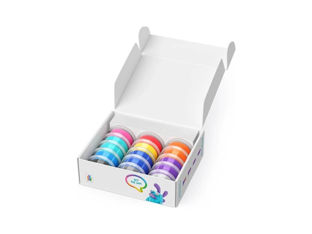 Mäkká, ľahko tvarovateľná hmota v 15 kelímkoch sa vďaka sprievodnej aplikácii mení na zábavného učiteľa modelovania.