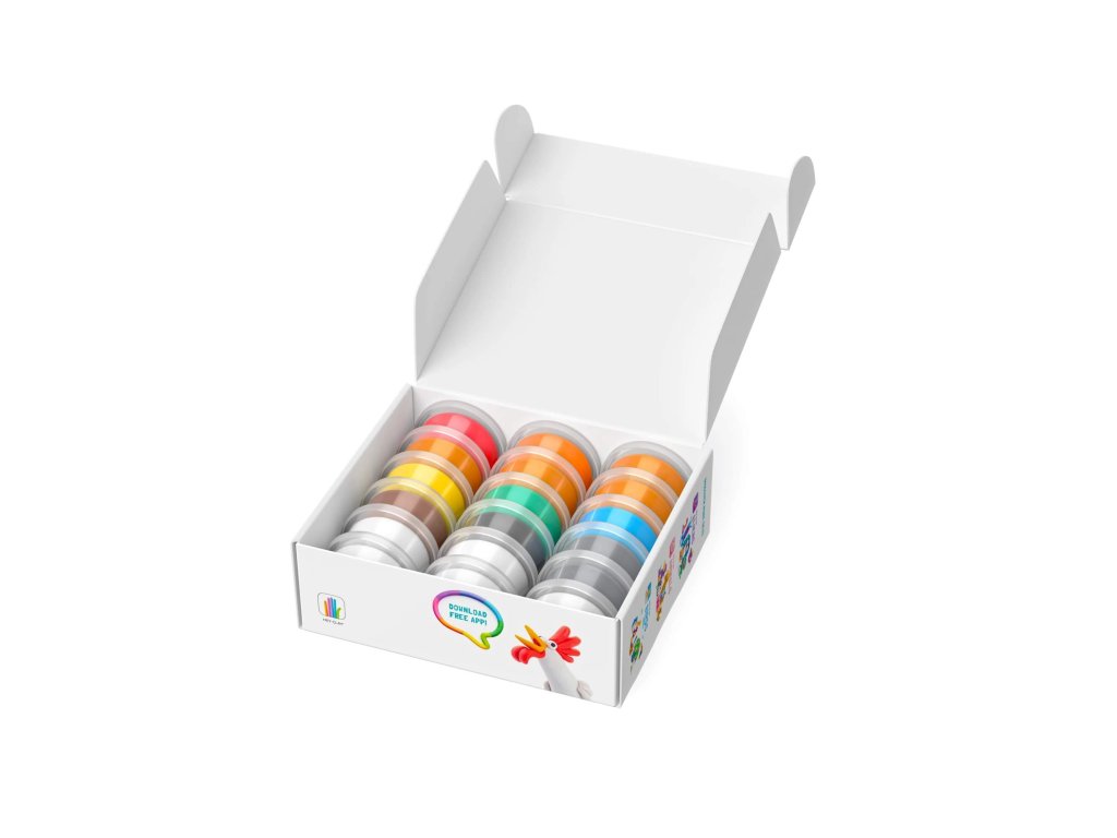 Mäkká, ľahko tvarovateľná hmota v 18 kelímkoch sa vďaka sprievodnej aplikácii mení na zábavného učiteľa modelovania.
