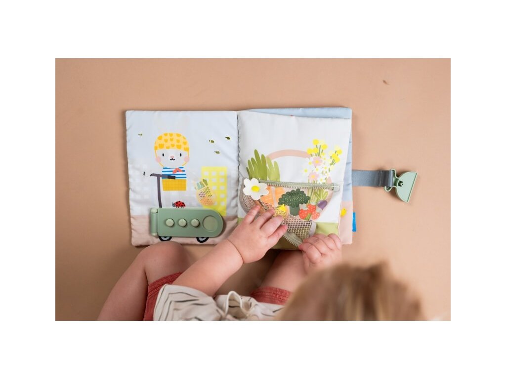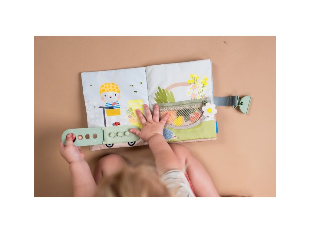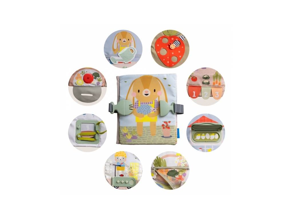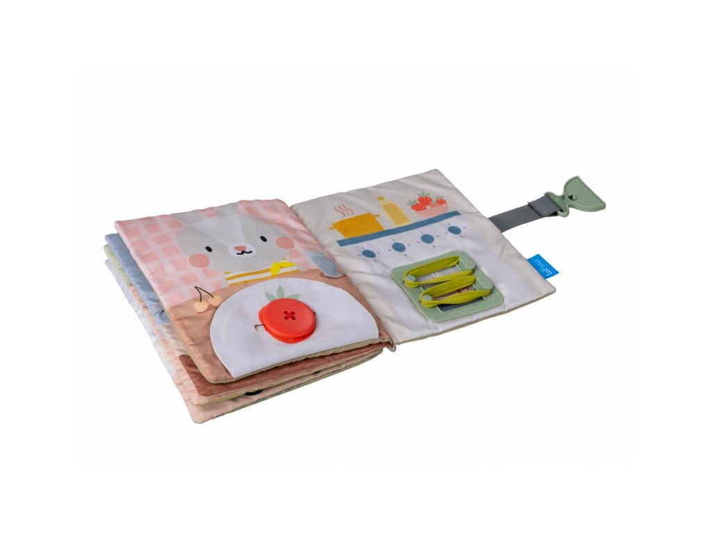 My 1st Busy Book od značky Taf Toys je mäkká látková knižka plná interaktívnych prvkov, navrhnutá pre deti od 18 mesiacov.