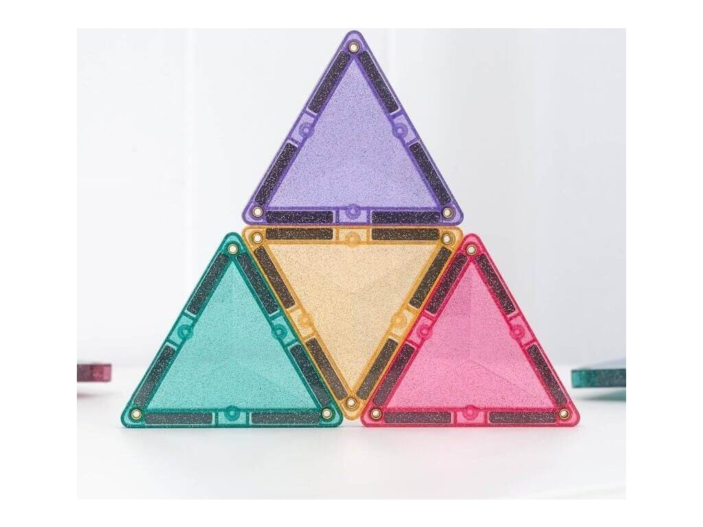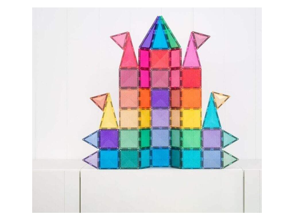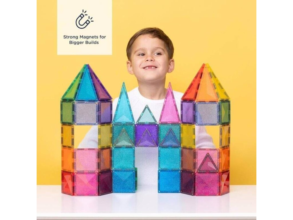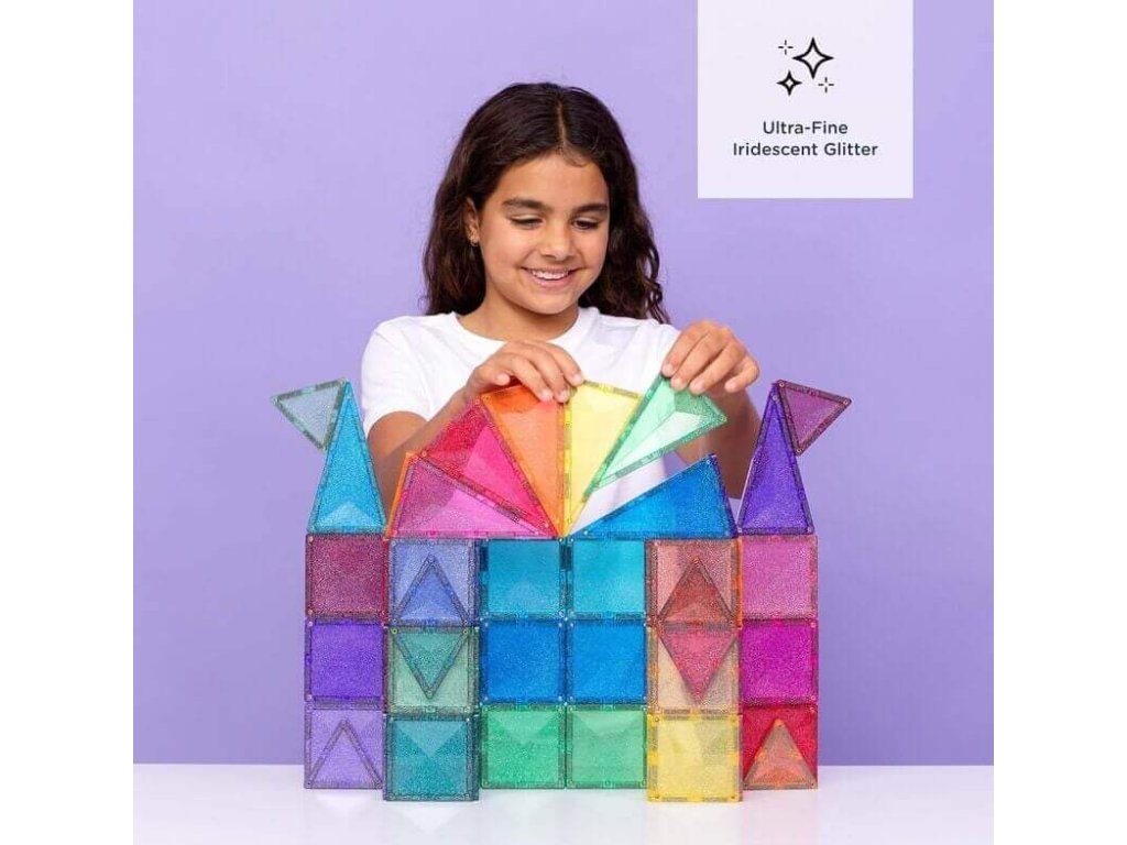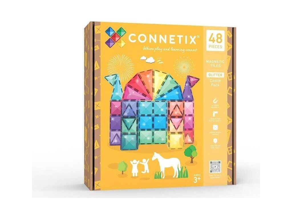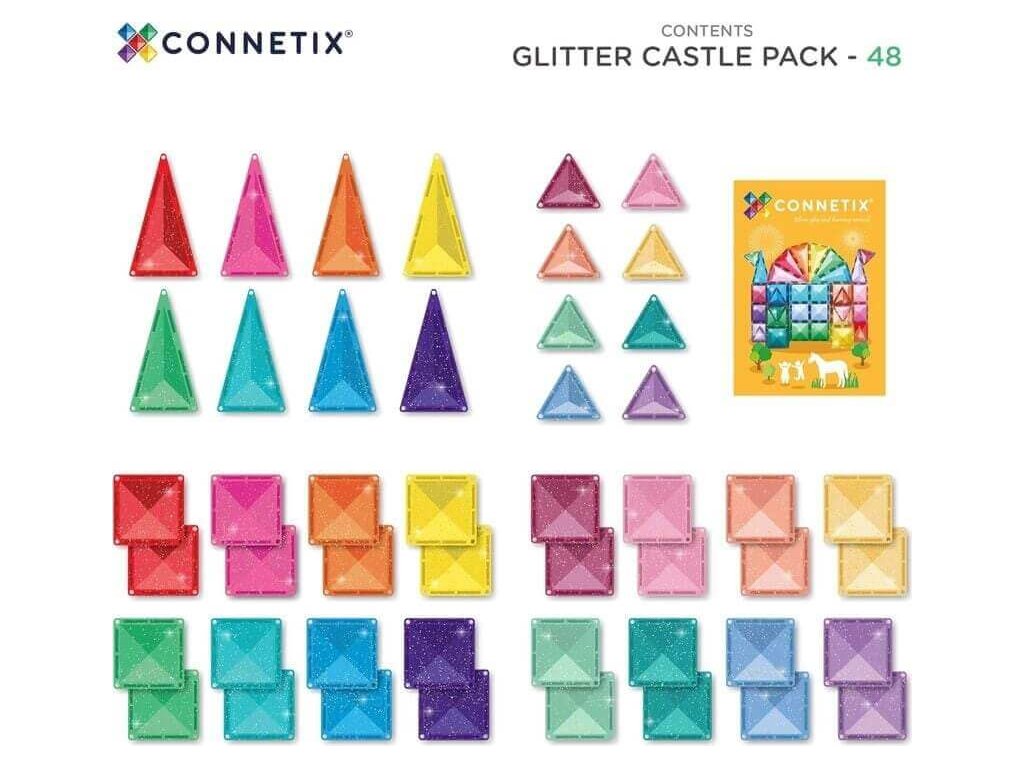 Connetix Glitter Castle Pack 48 dielov od značky Connetix je magnetická stavebnica s trblietavým efektom určená na stavanie hradov, veží a fantazijných stavieb.