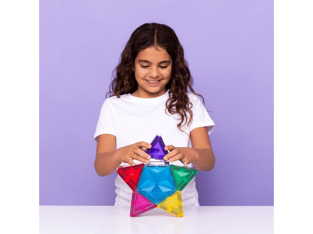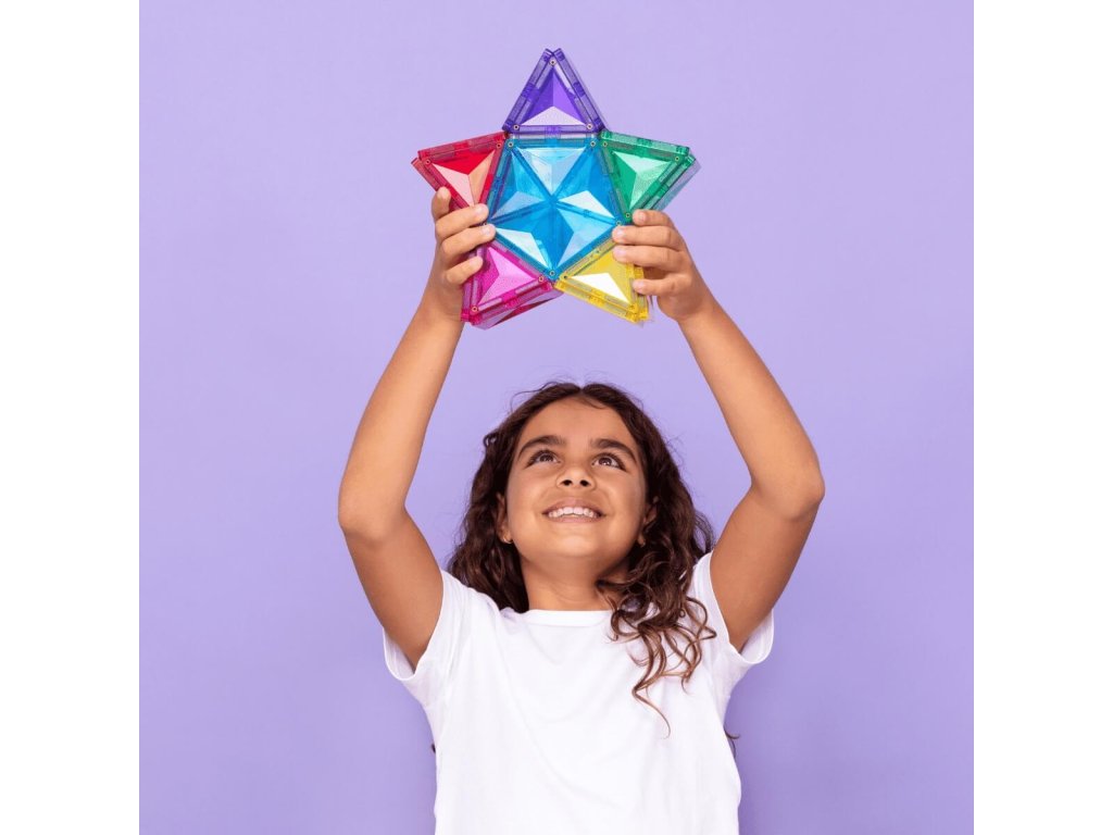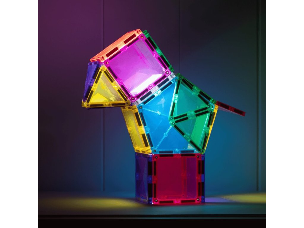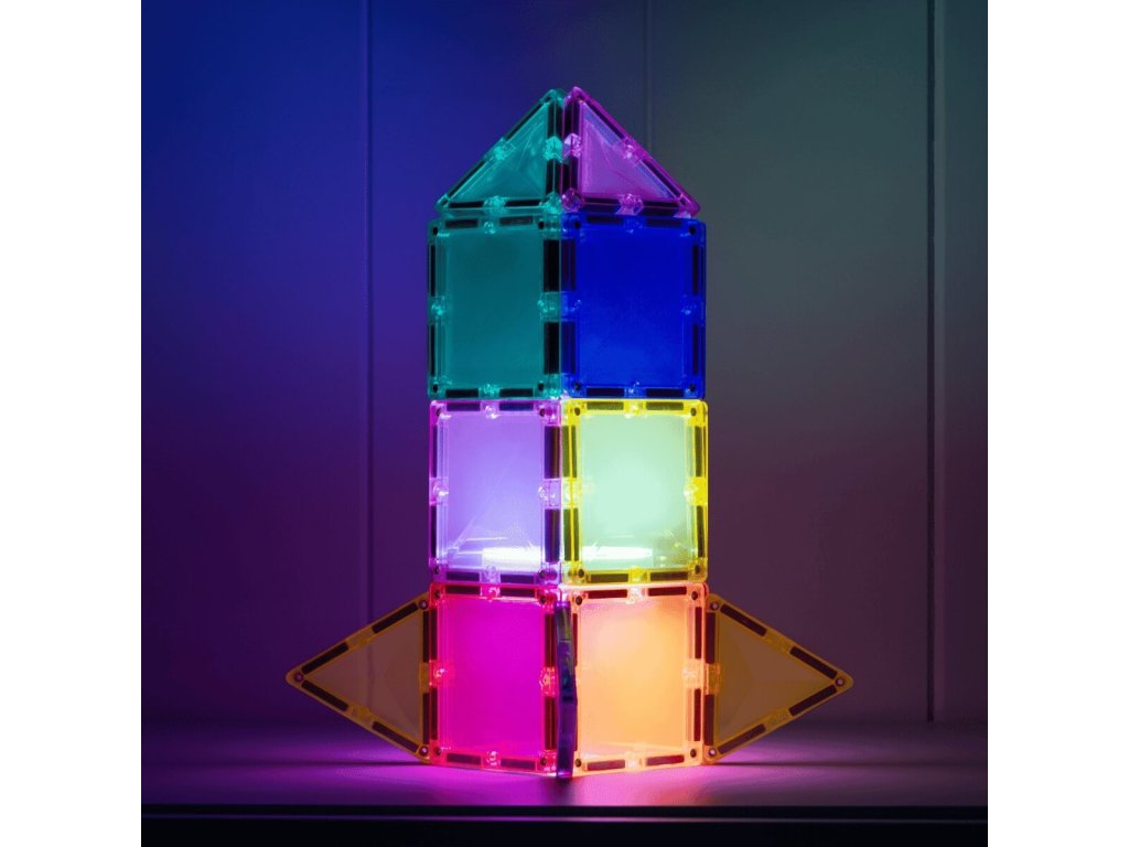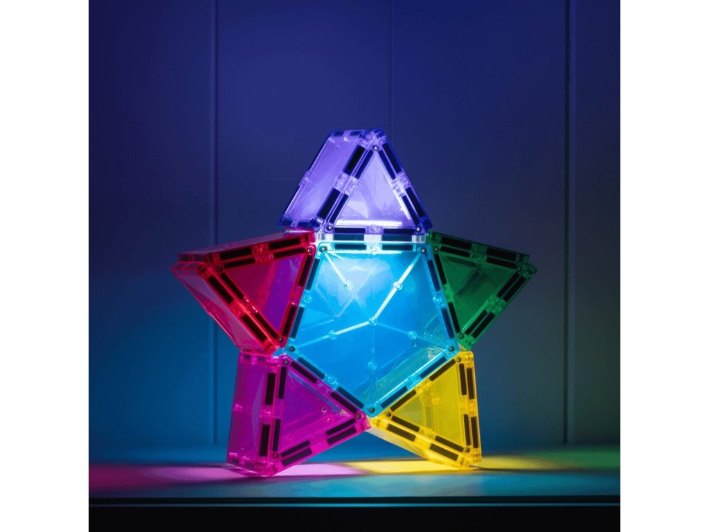 Magnetická stavebnica Light Star Pack prinesie do hry nielen krásne farebné dieliky, ale aj kúzlo svetla. Okrem klasických štvorcov, trojuholníkov a špeciálnych päťuholníkov sa v balení nachádza aj jedinečný svietiaci dielik, ktorý stavby premení na žiarivú atrakciu.
