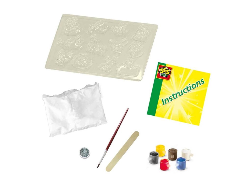 Balenie obsahuje formu s motívmi psíkov a mačičiek, sadru na odlievanie, 6 farieb, štetec na maľovanie, trblietky v tube, pomôcku na uhladenie sadry a návod na použitie. Rýchloschnúca sadra umožňuje rýchle výsledky, farby majú dobrú kryciu schopnosť a všetky materiály sa dajú jednoducho umyť z pokožky a textilu.