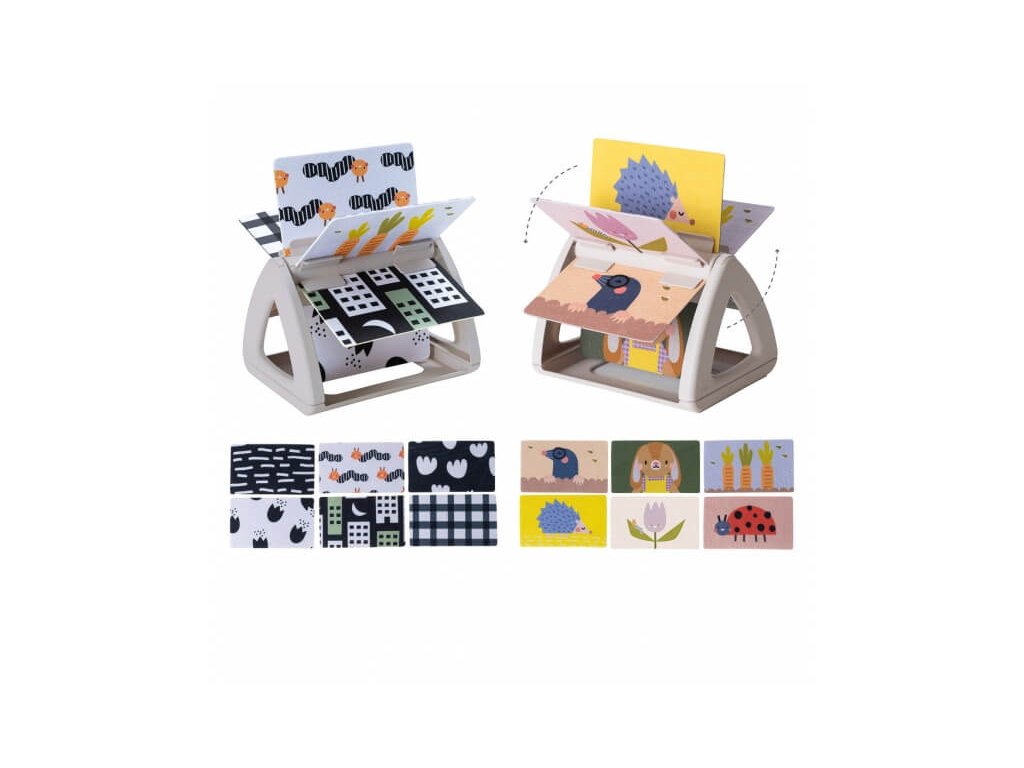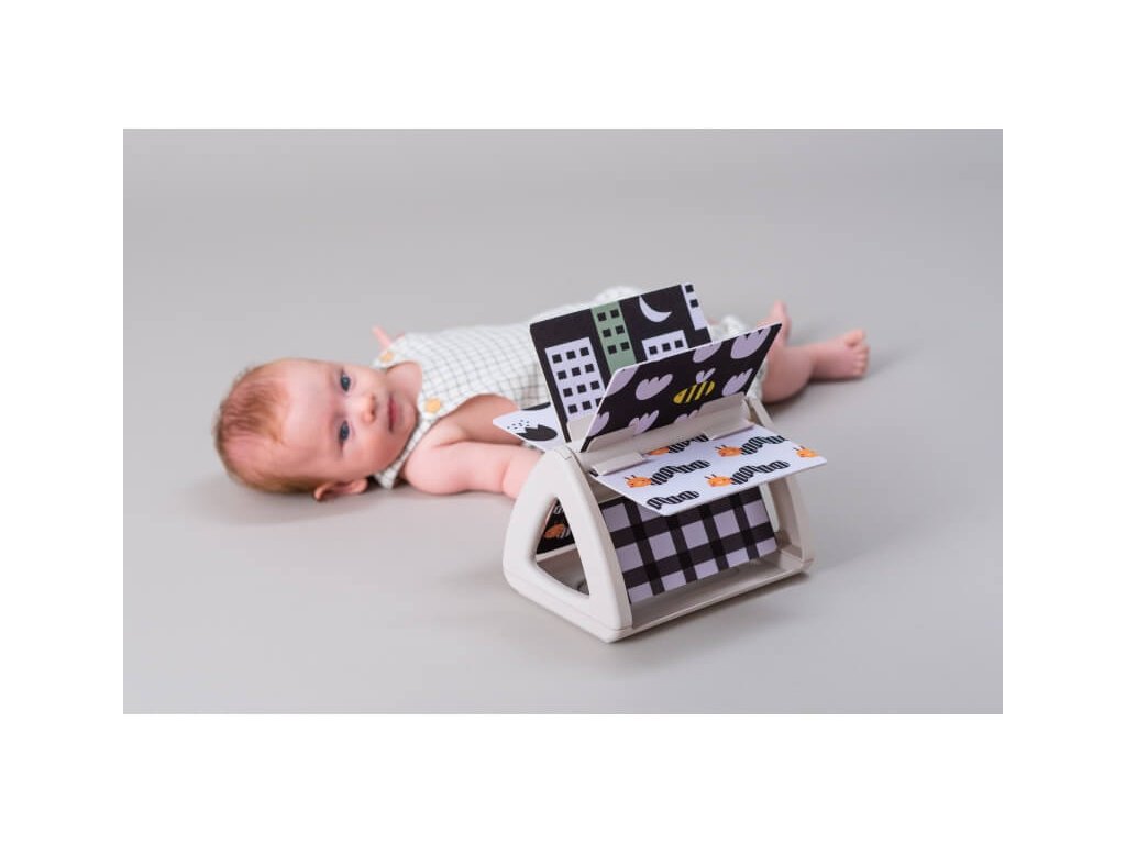 Na jednej strane sú obrázky v čiernobielom kontraste, ktoré pomáhajú rozvíjať zraku novorodencov, na druhej sú farebné ilustrácie záhradného sveta, ktoré bavia a stimulujú dojčatá od troch mesiacov.